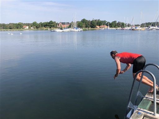 Blev en bakvänd runda idag Skälby, Getingen, stan, Varvsholmen, en stop-and-dip på Jutnabben, Funkabo, hem. Tröga ben idag men sträckte ut steget lite sista km som gick i 4:35. Micke och Jeanette med på sedvanligt vis. Nästan vindstilla, soligt, 18 grader vid start och 25 när man kom hem. Var verkligen skönt med badstoppet på Jutnabben.