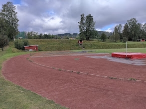 Uppvärmning, löpteknik och stegringar med värsta bästa tränarna på Strandvallens kolstybbsbana, 360 meter lång :-) Jätteroligt. Ytterst oskarp bild av banan.