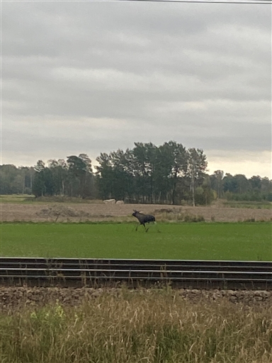 Fick sällskap av en Älg vid järnvägen vilket kändes lite kungligt! Helt ok väder med 12 gråter, genommulen grå himmel utan nederbörd och ganska mycket vind 5-6 m/sek.