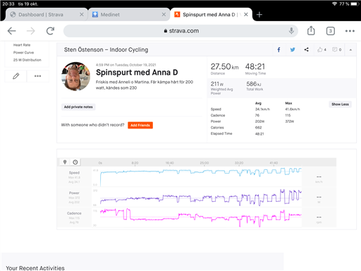 Jobbade hårt o blev helt slut men watten stannade på 202watt. Anneli o Martina var med.