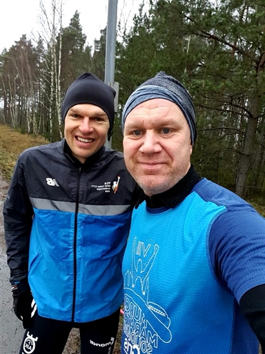 Skönt att ha löpningen gjord innan stormen kommer. Hade 5-6 grader, 5-6 m/sek vind, grått mulet men uppehåll på passet. Riktigt lurigt, halt och isigt, underlag på grusvägarna ut mot Täby men inga olyckor skönt nog.