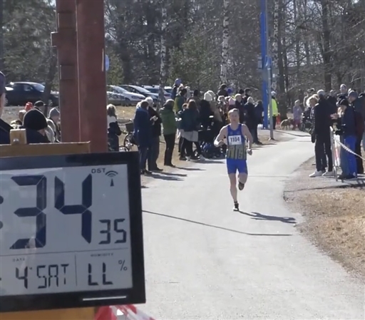 Jag springer fortsatt mer eller mindre själv. Har tagit nån och fått lucka men också blivit omsprungen och inte kunnat ta rygg. Krigar vidare med fokus att hålla fart varje km. Vid 6 km har jag 20,49 vilket är pers på 6k med 32”. Gläds en stund men fokuserar mot 7k som gått på 24,24. Har kollat pulsen under loppet men vet inte hur jag ska tolka den då jag ligger lägre än på tidigare 10k-lopp men ansträngningen känns likvärdig. Har nu puls på 176 / 180. Räknar att om jag snittar 3,30 sista 3k blir det 34,54. Jag måste därför säkerställa att jag sätter varje km för att ge mig bra förutsättningar. Vid 8k 27,47 och räknar ut att med samma resonemang blir nu sluttiden 34,47. Lite medvind igen på Norrköpingsvägen men har ingen sparring som motiverar. 9´onde går ändå på 3,30 med tiden 31,19 och jag kan tillåta mig att njuta lite redan här då jag till och med kan ramla, resa mig och gå i mål under 35. Micke och Henke har hejat runt längs banan men nu cyklar Micke även med en bit och manar på. Försöker öka och intala mig att jag gillar smärta. Får upp lite högre fart på universitetsrakan och upp i sista uppförslöpan. På upploppet som går nedför är det svårt att springa fortare än benen bär och har heller ingen framför eller bakom. Nöjd med den snabbaste km sist på 3,21 och puls 179 / 182. Officiell tid i mål 34,39,9 och PB med 86,77” sek. (inofficiellt 42sek)