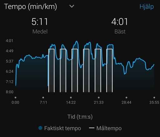 Fartintervall: 6 × { Löpn med tempo 4:30-4:48/km i 90 s // joggvila 90 s}