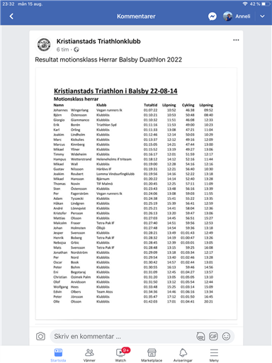 Björn 2:a på 1:10 jag 17:e av 40 på 1:23:43 första dam 1 min efter o sen Martina på 1:25:53 hon tog in en minut på sista löpningen
