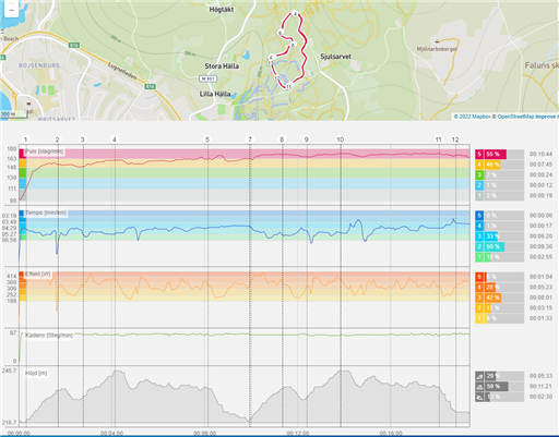 Kände under uppvärmning och stegringslopp att i hög fart, då känns höften inte riktigt bra. Men nu tävlar jag inte i backigt underlag i hög fart. Men i de brantaste nedförsbackarna kunde jag inte rulla på som jag önskade. Men trött blev jag ändå, uppför drev upp pulsen. Nästan 11 min i röd zon. Som väntat är jag inte i toppform så jag ska inte klaga för högt. Positivt var ändå att de två varven gick i princip i samma fart.