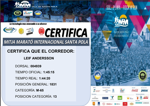 Santa Pola och en bana platt som en pannkaka. Perfekt väder med vind som knappt kändes och ca 11 grader och sol. Jag ställde mig rätt långt fram i sista ledet, då näst sista hade tider 1:30-1:40. Så jag gick in i fållan 25 min innan, för att hamna rätt långt fram. Såg farthållarna för 2h en bit fram och de för 1:45 ännu en bit framför. Knäppte igång min klocka när jag passerade mattan, vilket nog tog en knapp minut.