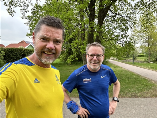 Var lite orolig för att träningsvärken från helvetet skulle sätta stopp för dagens intervaller. Men jag hade ju bokat med @hakanklippenbock så jag var tvungen att försöka. Det kändes bara lite i början men sen gav det med sig. Coach Garmin föreslog 2x20 min i 4:30-tempo. Och till vår stora förvåning så var det precis vad vi levererade. Vi fick inte feeling och sprang för fort utan höll oss till manus. 😳 Lite jobbigt men mest kul. Naturligtvis blev det även en vits. Har ni träffat Runkee-Per? 😇