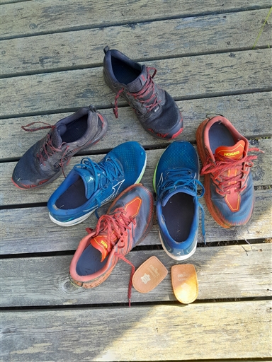 Efter att ha stukat till foten i jobbet har det blivit något fel i operationsfoten. Svårt att springa. Test av olika skor, sulor, hälkilar och löpsteg. Hooka med dubbla hälkilar får det bli.