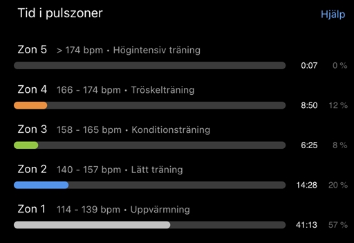 3” snabbare och 2 slag lägre snittpuls än för 6 veckor sen. Då 8’ zon3 och 12’ zon4.