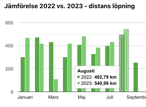 48+39+43+54=1841km = 104,8k/vecka eller 464km/mån (ökning 210km och +12,8%)