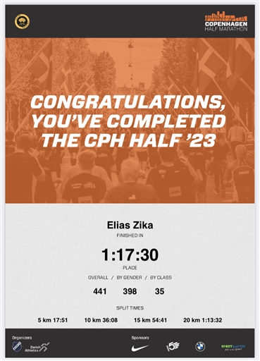 Ut på andra milen och här kommer Fredrik upp och vi växlar några ord. Han ser grymt stark ut och även om jag sprungit med en känsla av att kunna öka nu så finns det nivåer. Räknar ut att om jag snittar 3,57 (39,30) på andra milen blir det ändå pers. Det ger ett lugn och jag kan glädjas en kort stund. Vill ge det som finns idag och det är långt kvar. Fredrik får en lucka direkt och jag intalar mig att vara kall och ev kuna jobba mig ikapp senare. Halvvägs ca 38,15 och nu gäller det att inte tappa. 11k med 3,37 men ansträngningen börjar gå upp. Jobbar mentalt och tänker på det Micke sa (le så skickar du positiva signaler till hjärnan). Vidare mot 12k på 3,42 och tar en mellantid på Fredrik som nu glidit iväg med ca 12sek. En km i taget nu med en puls på 180 (5 slag över anaeroba tröskeln). Vet att jag fixar det tiden som är kvar men samtidigt att inget kommer gratis. 13k på 3,43 och vid 14k 3,47. Tar en gel till för att tagga till lite men känner ingen större skillnad. Krigar mot 15 k-passeringen som visar 54,41 (3,46) och 5´an på 18,34. Tappar men ingen katastrof. Dock rätt besviken då jag verkligen gått ut med tankar om att springa min första negativa split på HM. Pers på 15k med 1 min ger ändå en viss glädje och att det kommer bli pb även i mål om inget totalhaveri uppstår. Räknar ut att 3,40-3,45-fart ska ge ca 1,17,10 och tänker att om jag pushar nu kan SUB77 gå. Tar en km i taget med fokus på att hålla fart varje km. Jobbar mot 16k som visar 3,46. 5k kvar och måste öka! Försöker le och krigar vidare. 17km kommer och har gått på 3,43 vilket i alla fall är något bättre. 1,02,10 och räknar ut att 3,45-fart nu kommer ge 1,17,30. Vill inte ge mig än även om SUB77 känns kört. Blir lättare att räkna för varje km nu och tänker redan att med en spurt kan 11,00-11,20 hålla dom sista 3,1km. Kommer till 18k men ser 3,50 och långsammaste km hittills, dock med banans enda backe. 1,06,00 + 11,20 är 1,17,20 och planen håller skapligt. Tar en mun Red Bull i hopp om underverk. Nu är det bara pannbenet som jobbar men km går hyggligt fort trots allt. 19k på 3,43 och 1,09,43. 7,30 sista biten ska kunna gå men egentligen ingen tid att kriga för. Gör mitt bästa på näst sista med tanken om att öka sista km. 20k-markeringen kommer och då säger klockan 1,13,30 (3,47). Jag har nu 4´ till 1,17,30 och då är det 3,40-fart plus spurt som gäller. Försöker öka så gått jag kan men är nu rätt slut. Lång målraka ca 800m med nedräkning var 200m så lite lättare att pusha. Ger det som finns och korsar mållinjen på tiden 1,17,30.