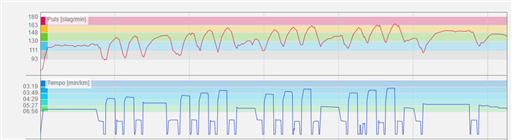 Man får pinna på rejält för att hinna med bandet i 18 km/h, det syns på kadenskurvan (som jag dock inte tog med i bilden). Jo, det är lite kul att springa snabbt och kort.