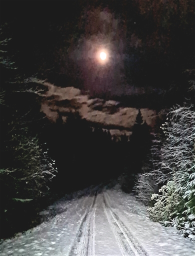 Månskenstur med lite snö i terrängen. Kändes inte speciellt halt trots snö och is. Temperaturen kröp ner mot -4 när jag var som längst bort.