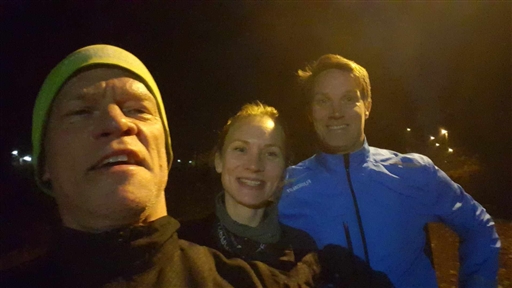 Madde och Andreas kom klockan fem och Patrik dök upp när vi hade gjort ett uppvärmningsvarv. Sedan kämpade jag och Madde tillsammans i intervallen, sex gånger runt korta slingan. Farten blev något högre än mitt tänkta hm-tempo på lördag, så det får väl sägas vara en bra uppladdning på tungsprunget underlag. Gubben nöjd.