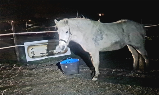 Kort promenad till stallet som är mycket närmare nu för tiden. Provade ny regnjacka som dock inte behövde bekänna så mycket i dimmregnet.