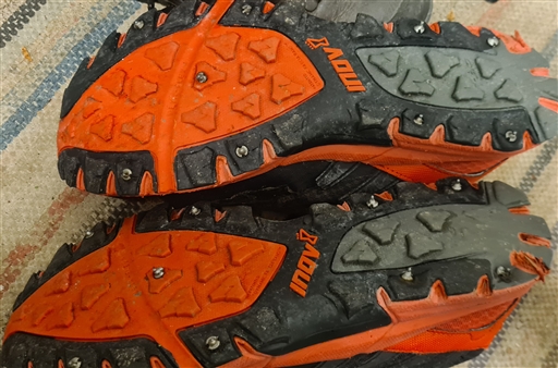 Ikväll var det väldigt halt på vägarna. Plockade fram mina dubbade Inov-8.