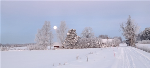 Krispig morgon och vacker måne vid horisonten.