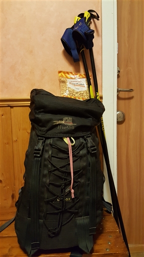 Tog fram min gamla klättersäck (35L) och fyllde den med livsmedel från mitt lilla förråd – konservburkar, ris, pasta mm. Toppade med 3 st 400g-påsar med jordnötter för att få säcken att väga 20 kg (kan annars rekommendera chipspåsar om man vill få ryggsäcken att se stor ut utan att det väger så mycket). Letade fram mina gamla ”gåstavar”. Tänkte jag behövde lite mer motstånd för att få upp pulsen iaf. något under dagens promenad.