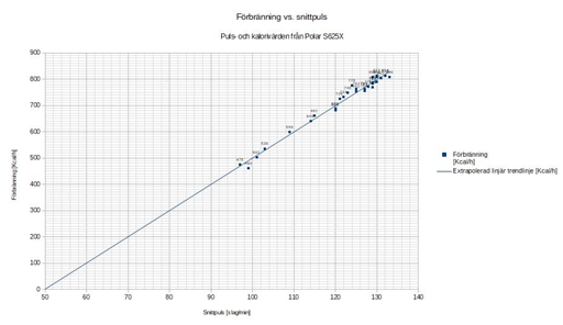 Jag roade mig med att plotta passen där jag haft en snittpuls på minst 90 bpm samt kaloriberäkningsfunktionen på pulsklockan aktiverad. Den funktion som klockan använder verkar vara rätlinjig. Om jag extrapolerar trendlinjen så som jag gjort i diagrammet får jag noll kcal/h vid snittpulsen 50 bpm. Det är rätt nära det snittvärde (48 bpm) som klockan mäter upp för min liggande vilopuls då jag gör ortostatiska tester varje morgon.
