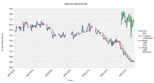 Det ser fint ut! Men hur är det med kurvan över löpande medeltal kring vikt? Den borde ju skära utfallsvärdena, men från mitten av december är ju den röda kurvan konstant över den blå. Kan det vara rätt?