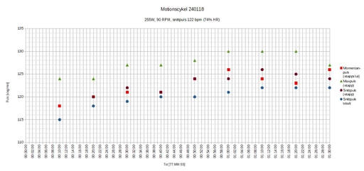 Då jag jämför dagens kurva för total snittpuls med första halvan av tisdagens pass på 250W belastning så ser jag att pulsen ligger något enstaka slag högre idag än i tisdags. Verkar som en rimlig skillnad då det var 5W mer i belastning idag, men jag tror knappast jag skulle ha pallat att köra med 255W i tre timmar idag. Även fast de ortostatiska testerna visar på att jag är återhämtad (även i morse) så känns benen tunga och tröga och det tar emot rent mentalt. Med tanke på hur det gått och känts den här veckan, och även med tanke på känslan i det efterföljande löppasset så tror jag att det är hög tid för en återhämtningsvecka nästa vecka. Detta för att få tillbaka både power/spring i benen samt motivationen.