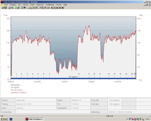 Nu har jag kompletterat passet och gjort en del justeringar efter att ha kollat pulsfilen. Bl.a. dragit av ca. 30 minuter som jag inte anser vara löpning. För km. 7,5 till 8 använde jag ett snittempo från km. 8 till 10, då det var samma underlag och terräng (motionsspår). Detta för att kunna få fram en ungefärlig tid då jag började springa igen. Det skulle iofs kunna gå om jag detaljstuderade pulsvärdena kring den tidpunkten, men jag ids inte lägga ned det jobbet. Hur skulle ni ha registrerat ett sådant här pass?