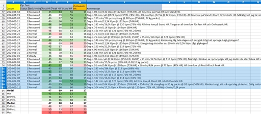 Annars ligger morgonpulsen fortfarande lågt och jag har, enligt pulsklockan, varit återhämtad 5 dagar av 7 under veckan. Det märks även på morgonpulsen att konditionen förbättras sakta men säkert. Under veckan noterade jag all time low på både stående vilopuls och den ortostatiska pulsen (skillnaden mellan puls i liggande och stående).
