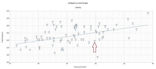 Av den bifogade grafen ser jag att snittpulsen under dagens pass ligger under trendlinjen och med ett tempo som varken är särskilt snabbt eller långsamt relativt min nuvarande träningsstatus, vilket jag tror tyder på att jag fortfarande är nedtränad.