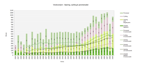 V.g. distanser så hamnade jag på ca. 9 mil löpning, ca. 1 mil promenad och ca. 10 mil cykling. Totalt ca. 20 mil. Inte så illa pinkat på en vecka, tycker jag. Det är inte en toppvecka v.g total träningsvolym, men ändå relativt hög volym. Det känns som en bra basnivå att fortsätta bygga vidare från.
