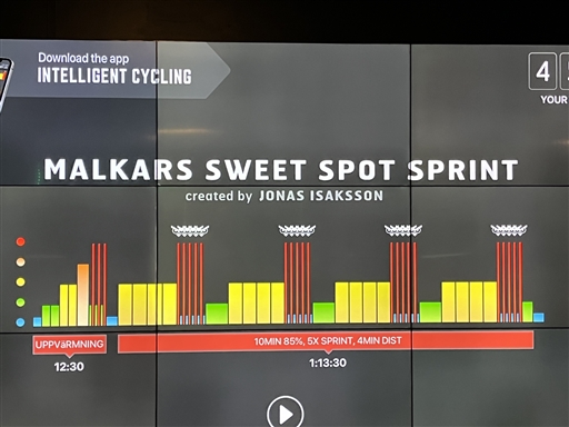 4 intervaller innehållande 10 min 85% ftp följt av 5 st 30 s i illrött med 30 s återhämtning