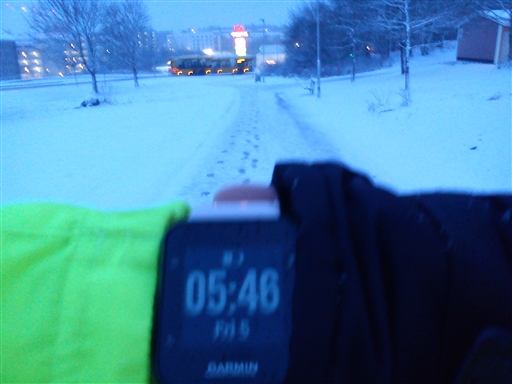Ut I snöfall, noll grader o vitt på marken. Tog ett direkt beslut att inte ta ett varv runt sjön, vill inte ta någon risk för snedtramp. Upp Emil Sjögren, badet, Pepparkakan, Timotejen o ut på Gredelbyleden. Förbi ICA, över järnvägsbron mot Ängby, Bönehuset, Q-star o hem. Underlaget var likt milkshake..