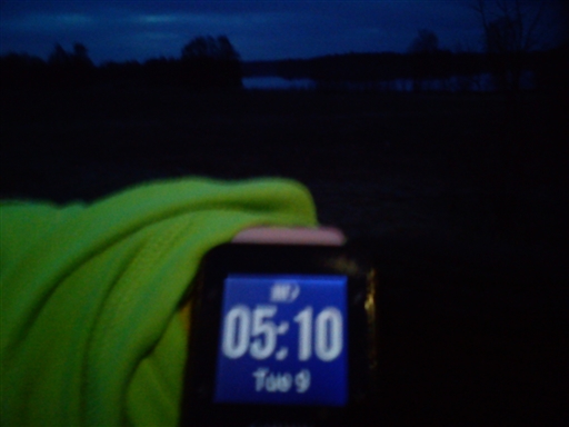 Ut I samma tid som igår, grå gryning. Genom byn o ner mot sjön. Upp o genom hagarna, tre skuttande harar. Ut på andra sidan, grusvägen. Ett gäng överkörda paddor i kurvan vid Noors slott. Precis innan hemmet mötte jag famla jobb-kompisen på cykel mot Arlanda.