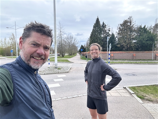 Jag fick lite känning i knät efter intervallerna i onsdags så igår var jag smart och vilade. Var lite orolig att det skulle komma tillbaka idag. Men det kändes helt ok. Inte helt borta men det gjorde inte ont varken under tiden eller nu efteråt. Dessutom hade jag tur och träffade på Lotta så jag fick sällskap några km. Hon fick även stå ut med en vits. 🤪
