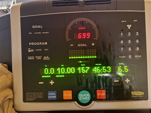 Efter 15 min uppvärmning stoppade jag bandet och var laddad för 10km löpband under 47min. Startade bandet och efter ett litet tag var bandet uppe i fart. Startade lugnt 12.2 km/h för att vara uppe i 13.0 km/h efter 10min. Hade räknat fram att höll jag sedan den farten skulle jag hamna under 47min. Blev nästan gränsfall då det tar rätt många sekunder, drygt 20s, innan bandet får upp farten. Jag blev lite orolig efter 3km att jag inte skulle orka. Men det gjorde jag även om det blev rätt slitigt och med hög puls. Passet får godkänt.