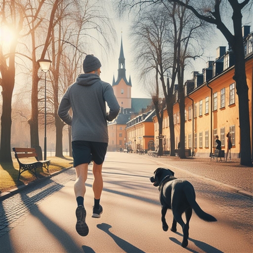En standardsväng med vovven. Glömde mobilen hemma så lät AI fixa bilden med prompten "Middle aged man jogging with his dog, a black labrador, in springtime in Uppsala, Sweden" 🙂