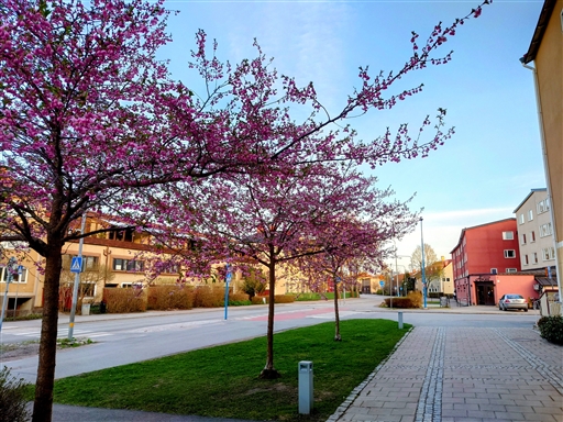 Körsbärsträden utanför porten har börjat blomma.