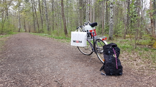 Inköpsrunda. Hade bl.a. en bal med toappapper med mig hem, hälften av rullarna på vardera sida om styret. Tot. 21,5 kg i last på hemvägen. Rullade från Willys ca. 16:15.