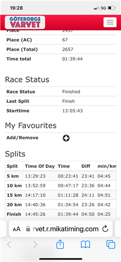 Kombinasjonen av for lite trening gjennom vinteren og 26 graders varme gjorde at dette ble mitt nest dårligste resultat i Varvet noensinne (løp dårligere en gang jeg var skadet). Ambisjonene var litt høyere, men jeg tar med meg at jeg klarte å ta meg sammen fra 15 km og inn da jeg skjønte at det eneste som var verdt å kjempe for var sub 100 min. Jeg tror det var mange som slet i varmen. Men for en fest: Rekordmange deltakere og masse publikum i sommerværet.