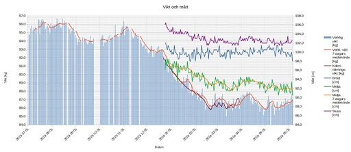 Jag har varit dålig på att sammanställa info kring bl.a. vikt och mått senaste månaderna. Dock har jag gjort mätningar och noterat resultat. Jag tog nyss tag i det och förde in den senaste månadens siffror i kalkylarket. Jag har dock ännu inte gått igenom kalorikontot.