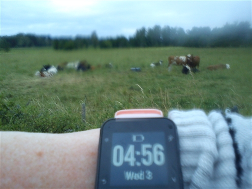 Ut I tidig morgon, skulle det komma regn? 14 grader o helt vindstilla. Genom byn o ner mot sjön som låg helt spegelblank. Upp o genom hagarna, passerade en tjej o hennes hund på tidig promenad. Korna sov skönt, Ut på andra sidan. Grusvägen o hemåt.