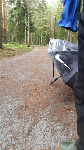 Vädret var väldigt ostadigt och skiftande. Det regnade och var sol om vartannat. Först gav jag mig ut 16:50 i bara shorts och en tunn vindjacka + löparskor + paraply, men då började det störtregna. Jag gick tillbaka in och bytte om till gummistövlar och helt regnställ. När jag kom ut igen vid 17:00 hade regnet slutat igen.