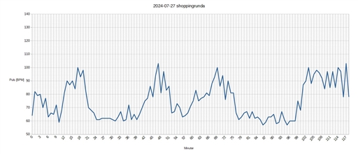 Räknar bara tiden då jag cyklade, eftersom snittpulsen för stopptiden (shopping mm) hamnade under normal promenadpuls (78) och cyklingen över.