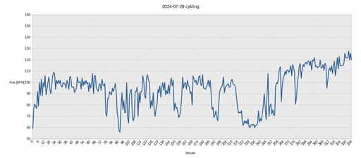 Jag gjorde en del kortare stopp förutom det långa stoppet i Kolbäck för att handla energi och äta. Men det intressanta är egentligen tiden exklusive stoppet i Kolbäck, samt snittpulsen för denna tid.