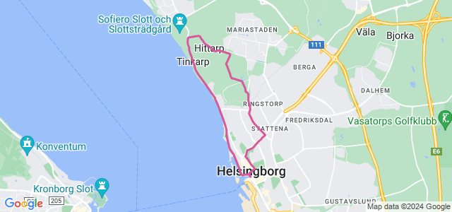 Knutpunkten - Hamnen - Strandpromenaden - Pålsjö skog - Krematoriet - Tågaborg - Hälsobacken - förbi Madamme Moustache mot Stortorget - Knutpunkten.