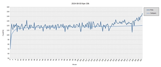 Jag började med att ha ca. 114 bpm som målsnittpuls. Det funkade bra idag. Under första 15k-varvet låg jag lite över, ca. 117 i snitt. Under andra varvet kände jag att jag hade lite mer kvar att ge och det kändes som att jag började gasa alltmer, ju närmare slutet jag kom. I själva verket var det nog bara min snittpuls som ökade, medan farten var ungefär samma som under varv ett. Det kändes ändå inte som att jag hade några tendenser att behöva slå av på takten, utan att jag hade en jämn och lagom intensitetsökning (som jag trodde var fartökning) under större delen av andra halvan.