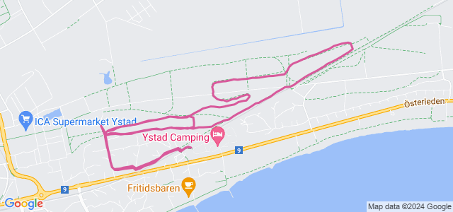 Ystad camping motionsspår 5 km och 1,5 km tillbaka till campingen