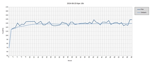 Justerat några pulsvärden i pulsloggen, som visade onormalt låga värden. Det rör sig om värdena för minut 9-11 samt 33, som visade 65 resp. 63 BPM. Det rör sig troligen om någon störning eller mätfel. Jag har justerat dem till snittet för de närmast omkringliggande värdena.