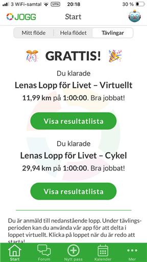 Det kanske inte var helt optimalt att köra ett ganska hårt cykelpass två dagar innan Stockholm Halvmarathon. Eller också var det det. Time will tell. Hursomhelst så blev det fem mil i fint cykelväder varav en timme mitt på lite hårdare för att få en distans till Lenas Lopp för Livet. Missade att komma upp i 30 km med 65 meter, lite surt. Så nu har jag varit retligt nära att pricka jämna distanser på både löp- och cykelupplagan av loppet.