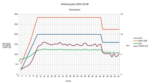 Jag körde i manuell mod. Först 9 minuters uppvärmning med upprampning av belastningsnivån ett steg, från 1 till 9 (53-253 jW), varje minut. Därefter konstant belastning på nivå 10 (284 jW) under 35 min. Slutligen 10 min nedvarvning på lite lägre belastning - nivå 8 (225 jW).