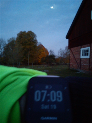Ut I frisk morgon, 9 grader o vindstilla. Månens sken följde mig genom byn o ner mot sjön. Upp o genom hagarna. Ut på andra sidan, grusvägen. Månen hängde kvar när morgonljuset kom. Helt magiskt start på denna dag! 🙂